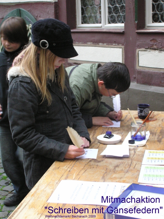 Besuchen Sie uns an unserem Stand auf dem Weihnachtsmarkt in Bacharach. Sie können dort unsere zahlreichen Schriften und Bücher direkt betrachten und kaufen. Reden Sie mit den Autoren der Bücher. Schreiben Sie wie anno dazumal mit Feder in alten deutschen Schriften.